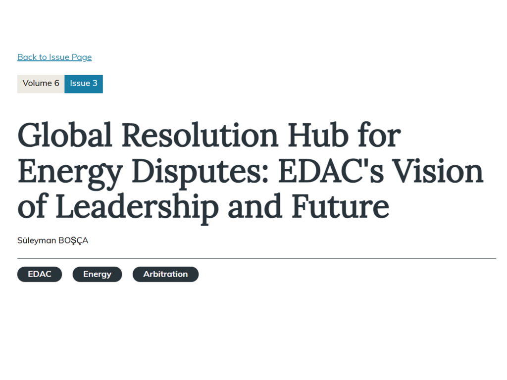 We are delighted to share that Energy Disputes Arbitration Center (EDAC) Chairman Suleyman BOSCA’s article, “Global Resolution Hub for Energy Disputes: EDAC’s Vision of Leadership and Future,” has been published in the ITA in Review!