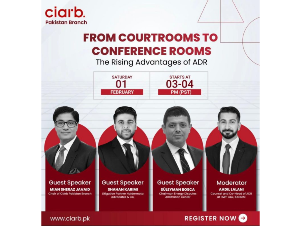 The webinar will also feature insights from leading legal professionals, including Mian Sheraz Javaid (Chair, CIArb Pakistan Branch), Shahan Karimi (Litigation Partner, HMCO), and Moderator Aadil Lalani (Counsel, HWP Law).